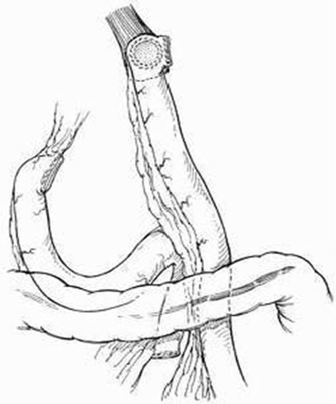 - Thì 4 cắt tá tràng: cắt tá tràng đóng mỏm tá tràng bằng máy stapler qua trocart 12 dưới sườn trái, Cắt đoạn hỗng tràng dưới góc treitz 40cm bằng stapler để chuẩn bị cho lập lại lưu thông tiêu hóa theo phương pháp Roux en y.