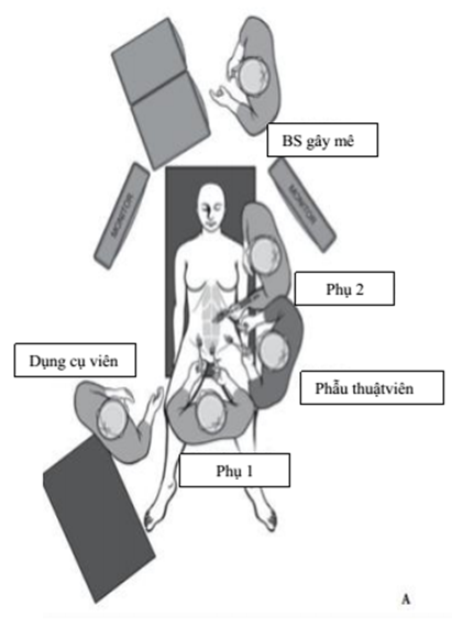 - Phẫu thuật viên đứng bên phải người bệnh, phụ 1 đứng giữa 2 chân người bệnh, phụ 2 đứng bên phải người bệnh, màn hình đối diện với phẫu thuật viên.