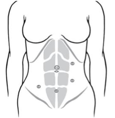 - Vị trí 5 trocart: Trocart 10-12mm lỗ rốn cho camera, trocart 10 đường giữa đòn trái mức dưới sườn, trocart 5mm đường giữa đòn trái mức ngang mào chậu cho phẫu thuật viên, trocart 5mm trên xương mu, trocart 5mm hố chậu phải