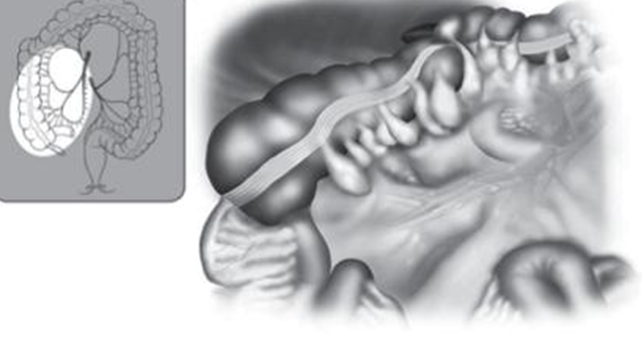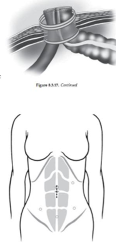 - Khâu lại vết mở bụng tối thiểu: bơm CO2 ổ bụng, khâu lại mạc treo hồi tràng tránh thoát vị nội. Đặt một dẫn lưu rãnh đại tràng phải