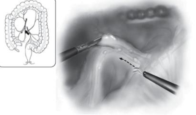- Giải phóng góc hồi manh tràng: Mở phúc mạc dọc theo đáy góc hồi manh tràng lên đến tá tràng giải phóng toàn bộ góc hồi manh tràng từ trong ra ngoài. Tiếp tục phẫu tích mạc Told phải Giải phóng đại tràng lên, chú ý bảo toàn bó mạch sinh dục và niệu quản phải.