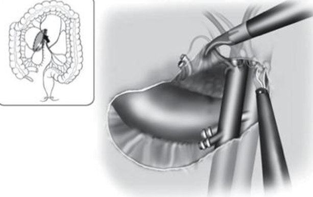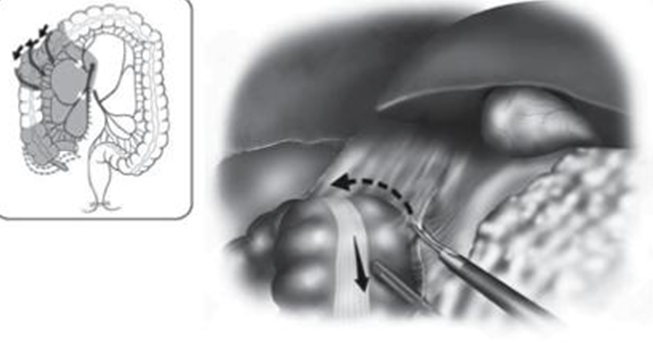 - Giải phóng đại tràng góc gan: Cắt dây chằng gan đại tràng tiếp nối với diện phẫu tích mạc treo đại tràng từ trong ra để kết thúc thì Giải phóng toàn bộ đại tràng phải.