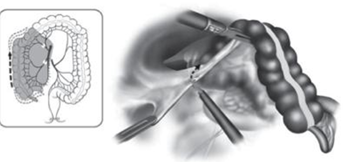 - Mở bụng tối thiểu: đường rạch 5cm ở vị trí trocart 10 mm lỗ rốn đưa toàn bộ đại tràng phải ra ngoài ổ bụng sau khi đã bảo vệ vết mổ. Tiến hành cắt đại tràng phải theo nguyên tắc ung thư, nối hồi đại tràng ngang bằng tay hay máy nối Stapler.