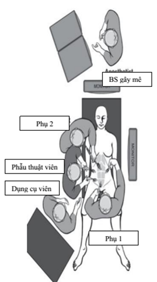 - Phẫu thuật viên đứng bên phải người bệnh, phụ 1 đứng giữa 2 chân người bệnh, phụ 2 đứng bên phải người bệnh, màn hình đối diện với phẫu thuật viên.