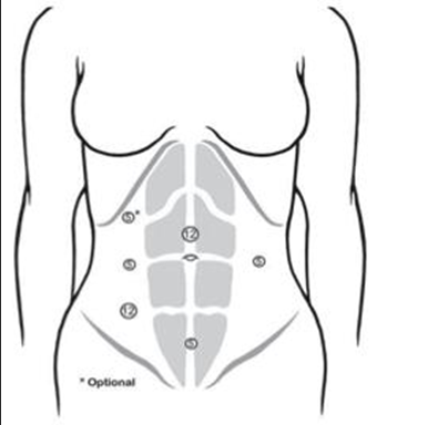 - Vị trí 6 trocart: Trocart 10mm giữa rốn cho camera, trocart 5mm đường giữa đòn phải mức dưới sườn, trocart 5mm đường giữa đòn phải mức ngang rốn, trocart 12mm hố chậu phải, trocart 5mm trên xương mu, trocart 5mm đường giữa đòn trái mức ngang rốn