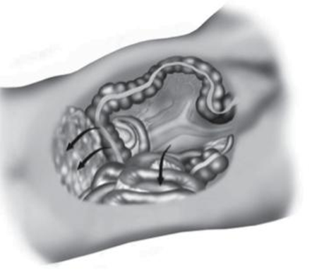 - Thì đánh giá tổn thương: người bệnh tư thế đầu thấp nghiên phải đẩy toàn bộ đại tràng ngang mạc nối lớn lên trên, bộc lộ tối đa vùng mổ là đại tràng sigma. Đánh giá toàn bộ ổ bụng, gan, phúc mạc, vị trí kích thước, độ xâm lấn khối u. Nếu là nữ có thể treo tử cung lên thành bụng