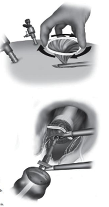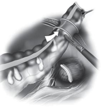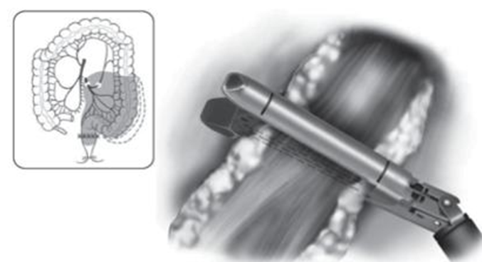 - Rạch da trên xương mu 5 cm, bảo vệ vết mổ thành bụng đưa đoạn đại tràng sigma ra ngoài thành bụng, cắt đoạn theo nguyên tắc ung thư, đặt đầu của máy nối tiêu hóa tròn vào lòng đại tràng, đóng kín lại bằng mũi khâu hình túi đưa trở lại ổ bụng, khâu lại vết mổ, bơm lại CO2.