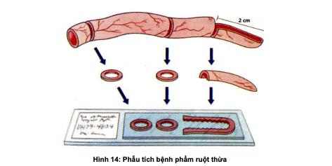 b. Cắt mẫu ra làm 2 phần, bằng cách cắt ngang cách đỉnh ruột thừa 2 cm.