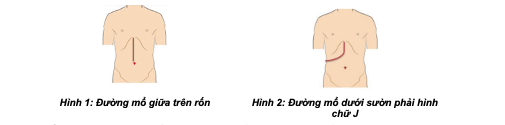 BƯỚC 1 - mở bụng: Đường mở bụng giữa trên rốn, có thể kéo dưới rốn thường được áp dụng, có thể mở bụng đường chữ J dưới sườn phải nếu khối u lớn