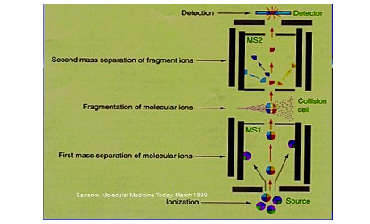 Trong hệ thống MSMS, các ion được lựa chọn của các chất phân tích được phân tách trong tứ cực thứ nhất (Q1), chuyển sang tứ cực thứ 2 (Collision cell) nơi mà khí trơ có áp lực cao gây phân mảnh đặc hiệu. Một ion sản phẩm của mỗi chất phân tích được lựa chọn đưa vào Q3 và phát hiện bởi đầu dò.