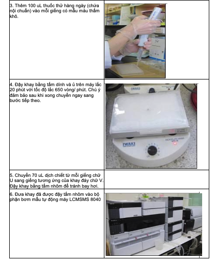 2. Thêm vào lọ chất nội chuẩn acid amin (AA) 1 mL dung dịch chiết và lắc kỹ đến khi tan hết trong 30 phút bằng máy lắc. Dung dịch này bền trong 30 ngày khi đóng kín và bảo quản trong tủ lạnh (+2 đến +8°C).