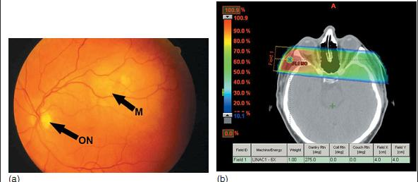 Các chùm tia khi xạ trị giảm nhẹ cho di căn màng mạch có thể xác định được trong mô phỏng. Trường chiếu 4x4 cm đánh dấu trên bề mặt với biên độ trước ở ngoài khóe mắt và tâm trường chiếu ở đồng tử. Trường chiếu chếch về phía sau 5° để tránh hoàn toàn thấu kính ở mắt đối bên. Xem xét phân bố liều lượng theo Dmax hoặc độ sâu của tổn thương di căn trên chẩn đoán hình ảnh.
