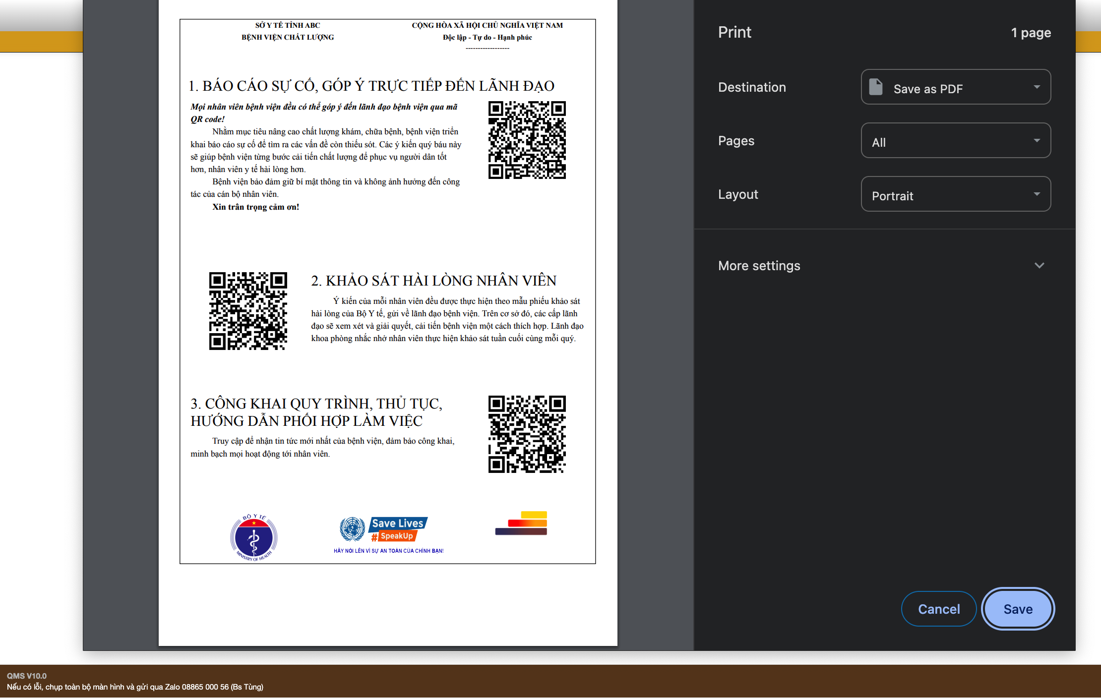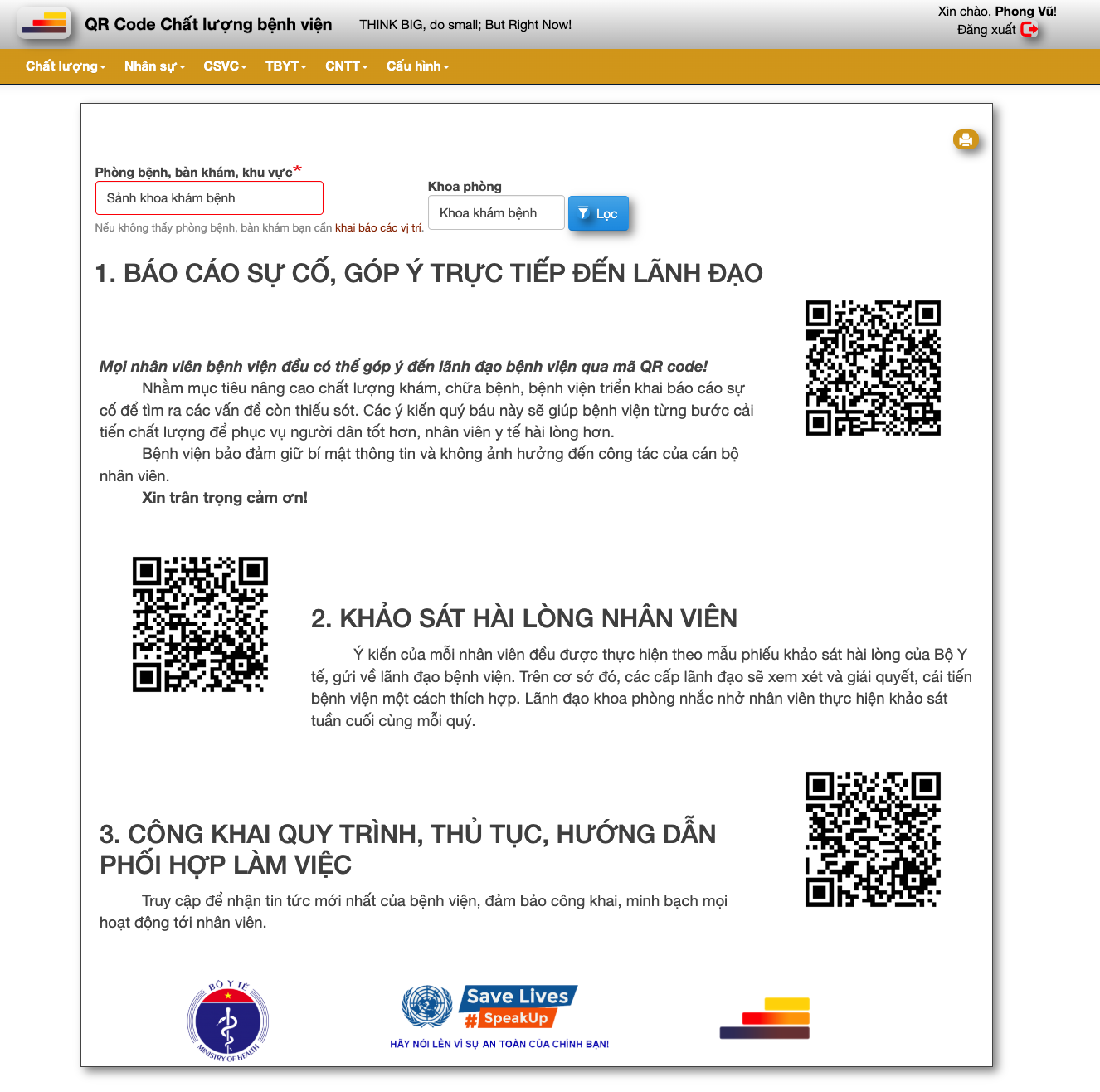 Nếu bệnh viện đã sắn sàng cho việc này, bạn có thể theo hướng dẫn dưới đây để lấy mã QR code. Phần mềm tích hợp mã QR Code báo cáo sự cố và QR code KSHL ngay trong poster này. Mỗi khoa phòng chỉ cần poster này để nhân viên có thể kết nối với hệ thống QLCL bệnh viện.