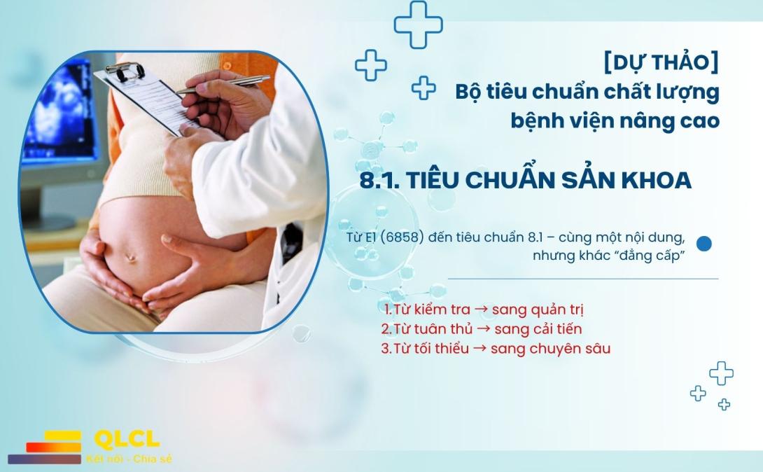 Trong Bộ tiêu chí chất lượng bệnh viện 2.0 (QĐ 6858), tiêu chí E1 – Chăm sóc sản khoa và sơ sinh là tiêu chí đại diện cho lĩnh vực sản khoa. Tuy nhiên, khi chuyển sang Bộ tiêu chuẩn chất lượng bệnh viện nâng cao, nội dung này được phát triển thành tiêu chuẩn 8.1 – Tiêu chuẩn sản khoa với phạm vi rộng hơn, sâu hơn và có tính hệ thống hơn.