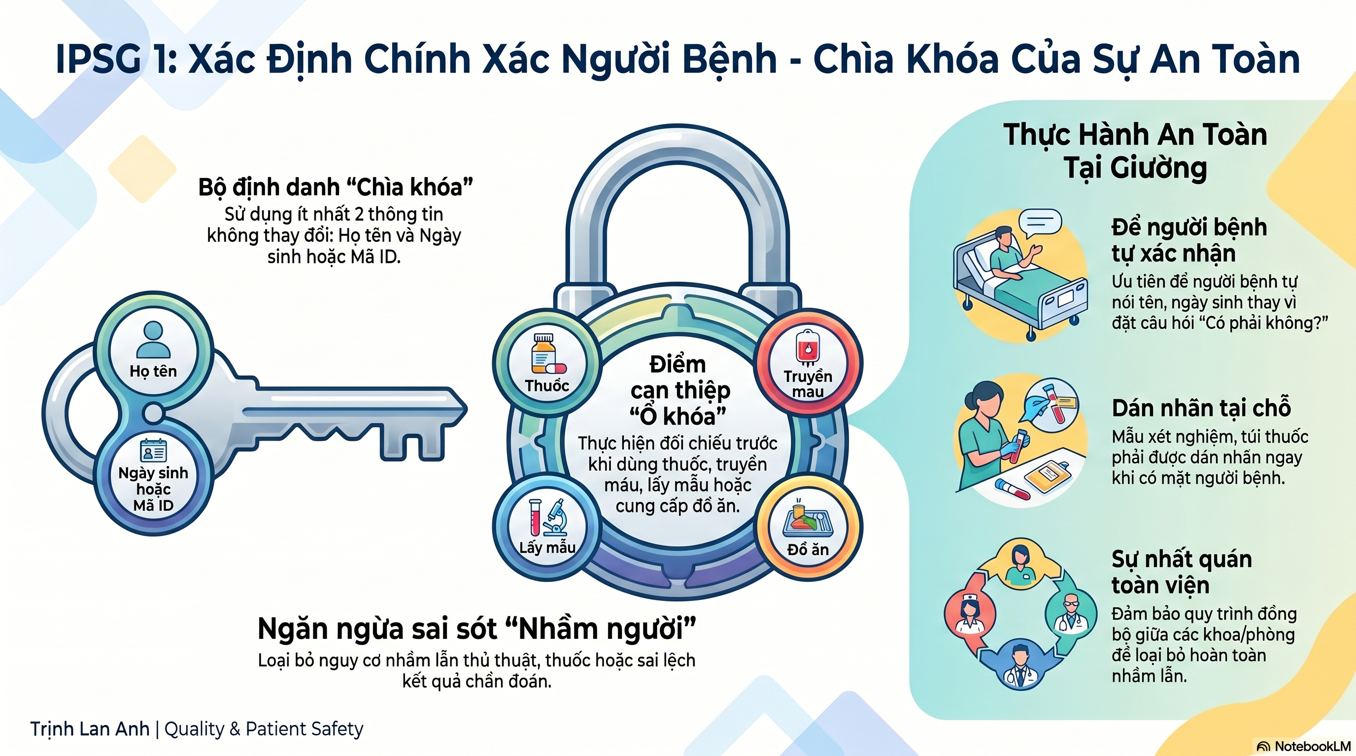 Mục tiêu IPSG.01.00 sinh ra để giải quyết một lỗi sai ngớ ngẩn nhưng gây hậu quả thảm khốc nhất trong y khoa: Nhầm người. Tiêu chuẩn này yêu cầu cốt lõi 3 điều sau: