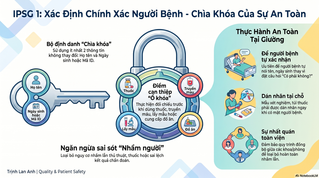 IPSG.01.00 quy định việc nhận diện đúng người bệnh bằng ít nhất hai thông tin định danh độc nhất, không sử dụng số giường/phòng, và phải thực hiện trước mọi can thiệp trong chăm sóc. Tiêu chuẩn nhấn mạnh cách thực hiện đúng – yêu cầu người bệnh tự cung cấp thông tin để tăng độ chính xác và giảm sai sót. Đây là điểm kiểm soát an toàn đầu tiên và quan trọng nhất, giúp ngăn ngừa phần lớn các sự cố y khoa ngay từ đầu.