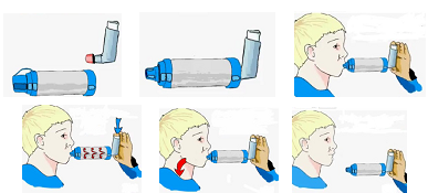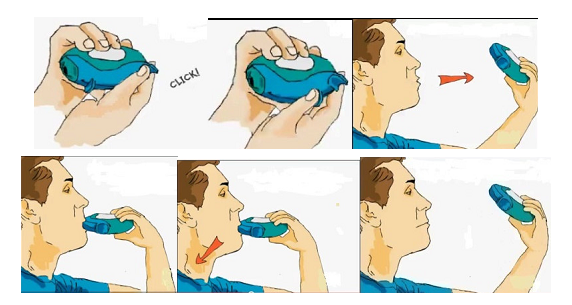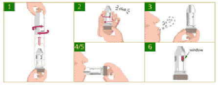 ▪ Thở ra hết ▪ Ngậm kín ống thuốc, hít vào bằng miệng mạnh, sâu đến khi không hít thêm được nữa ▪ Lấy ống thuốc ra, ngậm miệng lại, giữ nhịp thở trong 10 giây sau đó thở ra (nếu cần hít lần nữa thì làm lại các bước trên) ▪ Đậy nắp ống thuốc lại, súc miệng thật kỹ sau hít thuốc bằng nước để tránh những tác dụng phụ của thuốc có thể gây ra tại họng. | ![]() |
