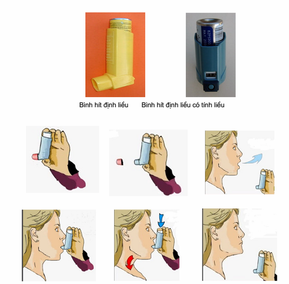 - Các dụng cụ bao gồm: bộ nén khí, ống đựng thuốc, ống ngậm hoặc chụp mũi - miệng và dụng cụ đo liều thuốc.