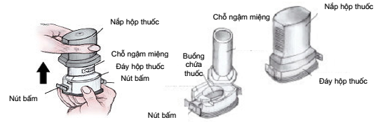 + Nhấn bình hít định liều một lần để phóng thích liều thuốc.