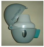 - HandiHaler là dụng cụ hít để phân bố tiotropium bromid (Spiriva) dạng bột khô. Khi sử dụng nang tiotropium được đặt ở giữa buồng của dụng cụ, khi ấn nhả nút xanh, nang thuốc bị chọc thủng, khi hít vào dòng khí phân bố thuốc qua ống ngậm. Cách sử dụng: ▪ Lấy nang thuốc ra khỏi vỉ (ngay trước khi sử dụng). ▪ Đặt nang thuốc vào giữa buồng. ▪ Đóng ống ngậm chặt đến khi nghe tiếng click. | ![]() |