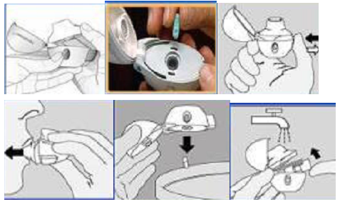 ▪ Ấn, nhả cả hai nút để chọc thủng nang. ▪ Giữ dụng cụ ở tư thế ngang và hít sâu. ▪ Bỏ dụng cụ ra khỏi miệng, giữ nhịp thở trong 10 giây. ▪ Thở ra. ▪ Mở dụng cụ và kiểm tra nang thuốc, nếu còn bột thuốc lặp lại các bước trên. ▪ Lấy vỏ nang thuốc và đóng ống ngậm. | ![]() |