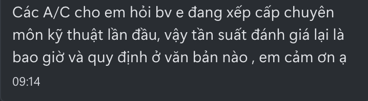 Các A/C cho em hỏi bv e đang xếp cấp chuyên môn kỹ thuật lần đầu, vậy tần suất đánh giá lại là bao giờ và quy định ở văn bản nào , em cảm ơn ạ