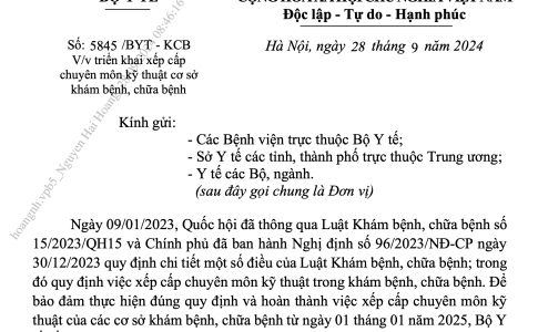 Công văn 5845/BYT-KCB V/v Triển khai xếp cấp chuyên môn kỹ thuật cơ sở khám bệnh, chữa bệnh