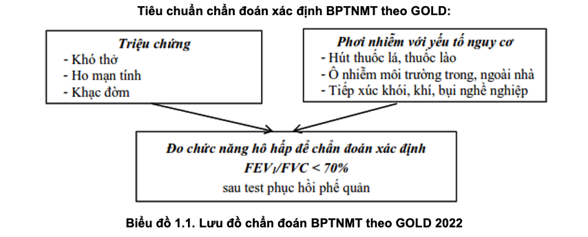 + Chẩn đoán xác định khi: rối loạn thông khí tắc nghẽn không hồi phục hoàn toàn sau test hồi phục phế quản: chỉ số FEV1/FVC < 70% sau test HPPQ.