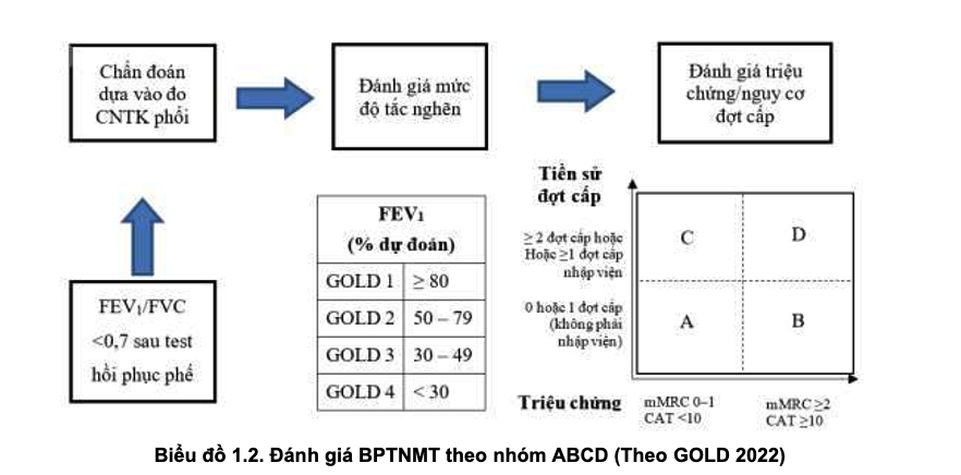 Sau khi đánh giá toàn diện, bệnh nhân nên được phân loại theo mức độ tắc nghẽn GOLD1234 và nhóm ABCD. Ví dụ: Chẩn đoán: BPTNMT GOLD 4, nhóm B.