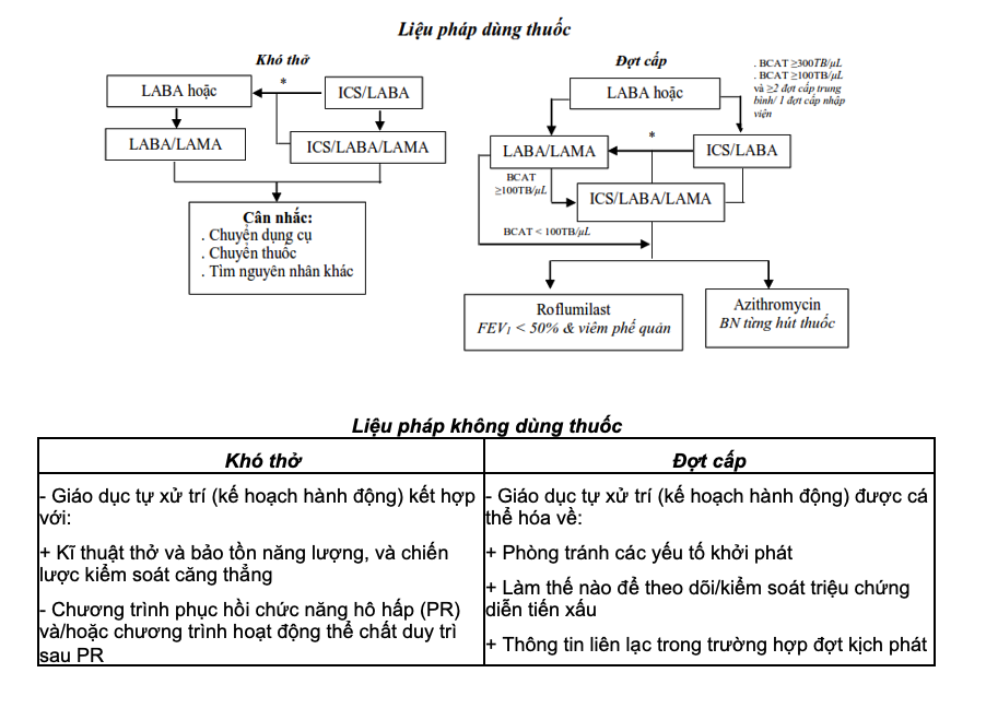 Oxy liệu pháp: Thở oxy liên tục ở bệnh nhân BPTNMT nặng có hạ oxy máu lúc nghỉ giúp giảm khó thở, giảm tử vong và cải thiện chất lượng cuộc sống; không có bằng chứng thở oxy giảm khó thở ở bệnh nhân BPTNMT nặng không có hạ oxy máu.