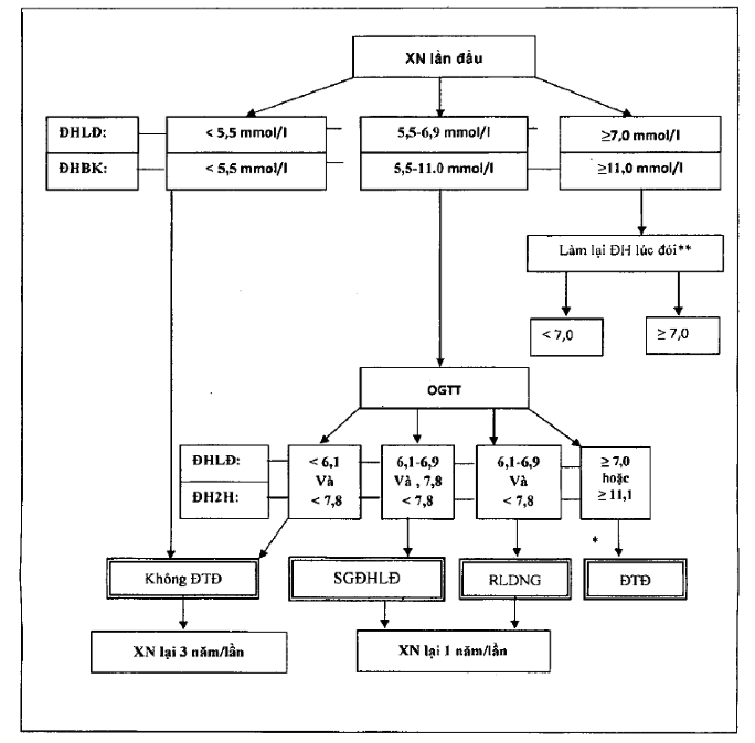 * Xác định lại chẩn đoán nếu đường máu lúc đói ban đầu 5,5-6,9 mmol/l hoặc đường máu bất kỳ 5,5-11,0 mmol/l.
