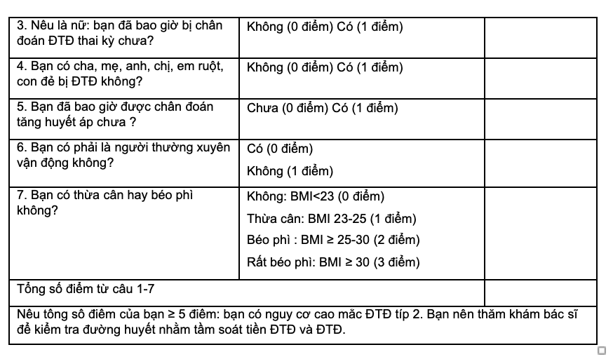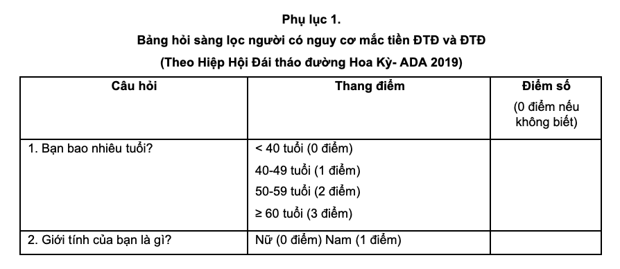 Tham khảo thêm Bảng hỏi sàng lọc người có nguy cơ mắc tiền ĐTĐ và ĐTĐ trong Phụ lục 01 ban hành kèm theo Quyết định, để đánh giá nguy cơ mắc Tiền ĐTĐ, ĐTĐ.