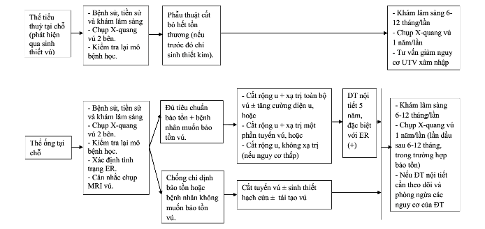 - Sinh thiết tổn thương (u nguyên phát, hạch, các tổn thương nghi ngờ di căn): để chẩn đoán mô bệnh học và đánh giá các dấu ấn sinh học. Tùy từng trường hợp mà áp dụng các biện pháp: sinh thiết kim lõi, sinh thiết vú có hỗ trợ hút chân không (vacuum-assisted breast biopsy -VABB), sinh thiết định vị dưới hướng dẫn của chẩn đoán hình ảnh, sinh thiết định vị kim dây, sinh thiết mở, sinh thiết tức thì trong mổ. Đối với tổn thương nghi ngờ bệnh Paget cần sinh thiết kim tổn thương vú (nếu có) và sinh thiết da phức hợp quầng-núm vú với đủ độ sâu (full- thickness skin biopsy).