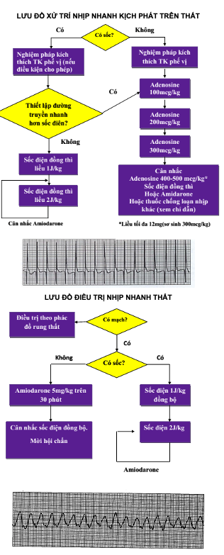 - Sốc điện đồng bộ: nhịp nhanh thất có mạch, nhịp nhanh kịch phát trên thất, sau khi điều trị thuốc thất bại hay có rối loạn huyết động.