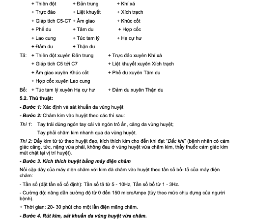 - Vựng châm: Người bệnh hoa mắt chóng mặt, vã mồ hôi, mạch nhanh, sắc mặt nhợt nhạt. Xử trí: tắt máy điện châm, rút kim ngay, lau mồ hôi, ủ ấm, uống nước chè đường nóng, cho người bệnh nằm nghỉ tại chỗ. Day bấm các huyệt: Thái dương, Nội quan. Theo dõi sát mạch, huyết áp.