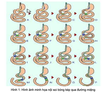 - Nội soi bóng kép qua miệng hướng dẫn người bệnh nằm tư thế nghiêng trái, chân trên co, chân dưới duỗi. Cho người bệnh ngậm canuyl, bắt đầu đưa máy soi và bóng có bôi trơn Xylocaine jelly qua đường miệng, khi máy soi vào dạ dày hút hơi và dịch dạ dày tránh để cuộn máy, khi máy soi vào tới hang vị điều dưỡng phụ bắt đầu luồn overtube với kỹ thuật đẩy kéo dựa trên nguyên lý bóng ở phần đầu có tác dụng giữ chặt vào thành ống tiêu hóa giúp máy soi có thể đi vào vị trí sâu hơn mà không bị cuộn máy, bóng thứ hai giúp máy không bị kéo ra ngoài khi thao tác overtube quan sát niêm mạc dạ dày hành tá tràng và tá tràng, ruột non. Ra y lệnh chụp ảnh minh họa tổn thương, hoặc sinh thiết nếu cần.