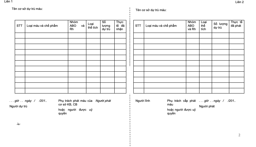 Phụ lục 8: Phiếu dự trù và lĩnh máu, chế phẩm mẫu ngoại viện (giữa cơ sở truyền máu và cơ sở khám bệnh chữa bệnh)