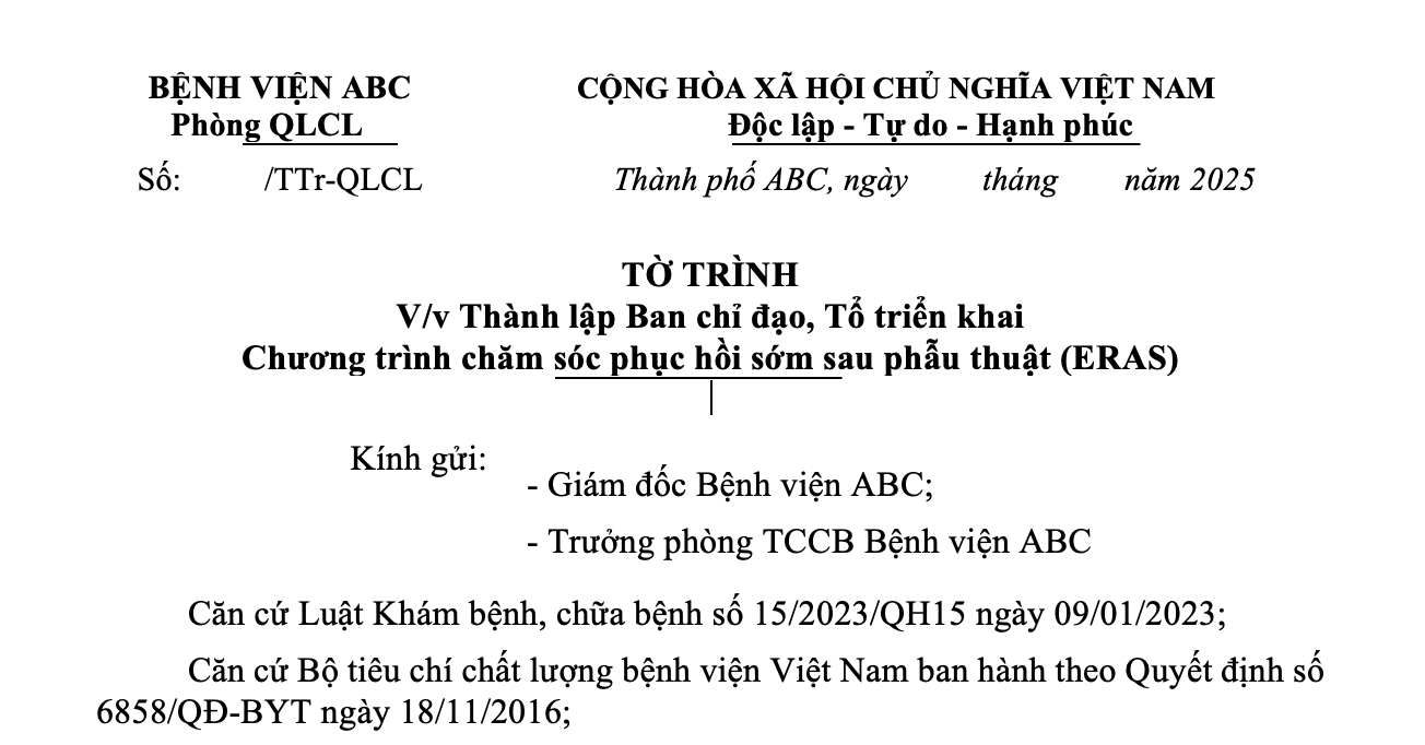 1. TỜ TRÌNH V/v Thành lập Ban chỉ đạo, Tổ công tác triển khai Chương trình chăm sóc phục hồi sớm sau phẫu thuật (ERAS)
