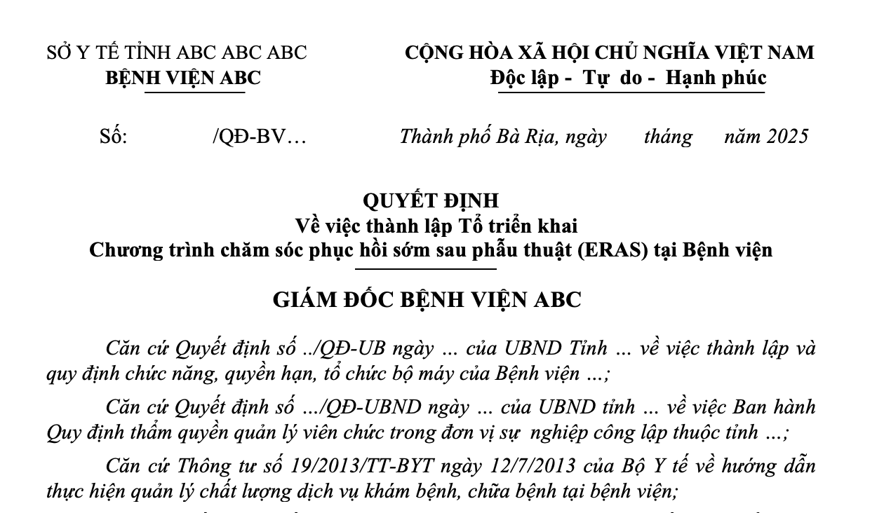 Căn cứ Kế hoạch số …/KH- BV… ngày … của Bệnh viện về việc triển khai Chương trình chăm sóc phục hồi sớm sau phẫu thuật (ERAS);