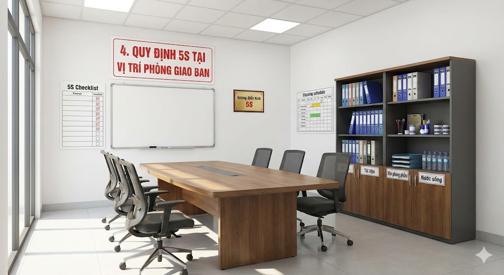 Phòng giao ban là nơi diễn ra các hoạt động quan trọng của khoa và bệnh viện: họp giao ban, thảo luận chuyên môn, báo cáo thông tin, triển khai kế hoạch, đưa ra quyết sách và đánh giá chất lượng. Không gian này cần môi trường trang nghiêm, khoa học và thuận tiện cho phối hợp công việc. Vì vậy, việc áp dụng 5S đóng vai trò đặc biệt trong việc chuẩn hóa cách bố trí, sử dụng và bảo quản thiết bị, giúp nâng cao hiệu quả tổ chức cuộc họp và tạo hình ảnh chuyên nghiệp cho toàn đơn vị.