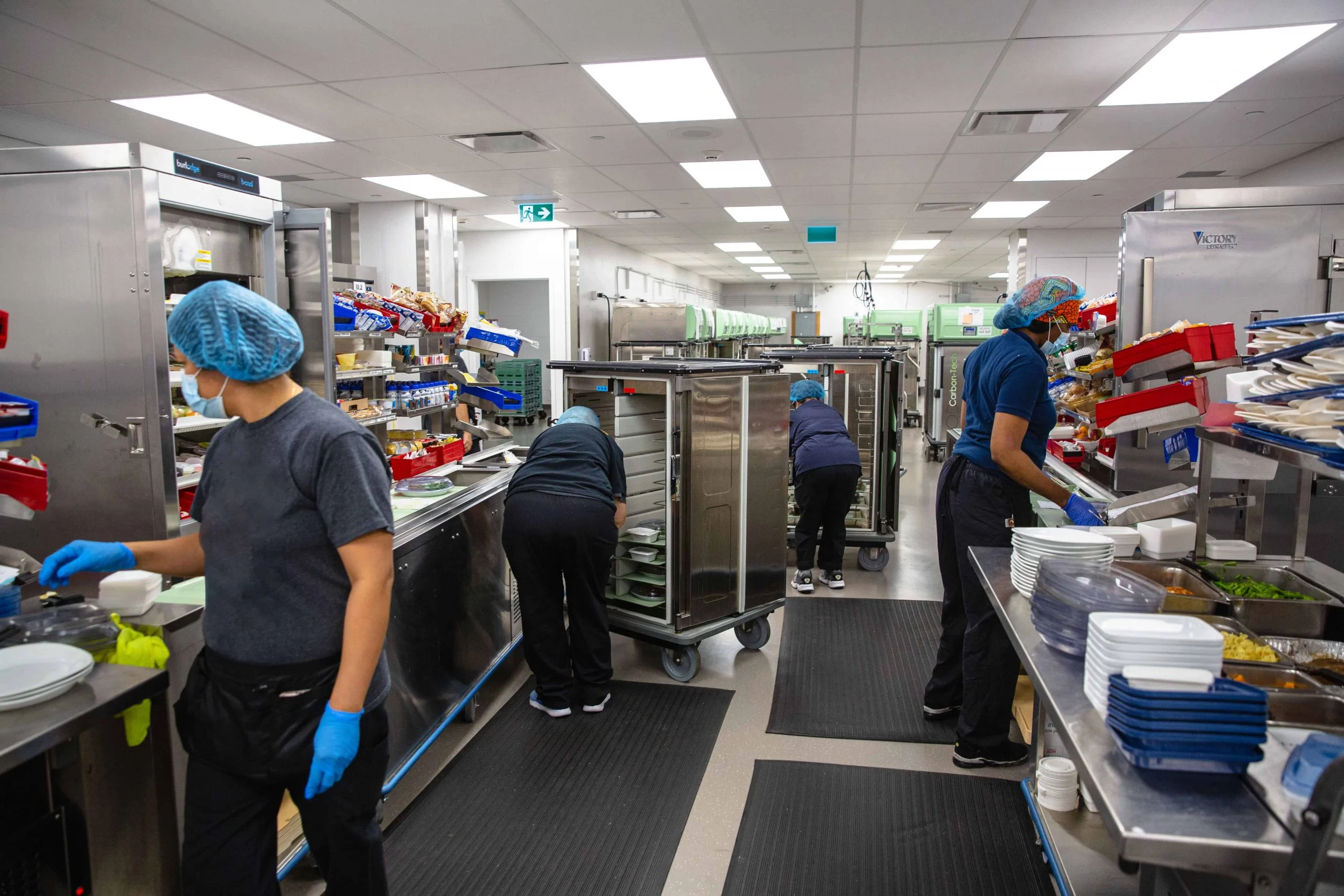 • Kiểm tra – vệ sinh (Shine): vệ sinh bàn chia, dụng cụ múc, thớt, sàn, xe suất ăn và khu đóng gói theo lịch chuẩn hóa; kiểm soát nhiệt độ món ăn trước khi chia; xử lý ngay các vết đổ, rơi vãi; bảo đảm khu vực không có côn trùng, nước đọng hoặc mùi lạ.