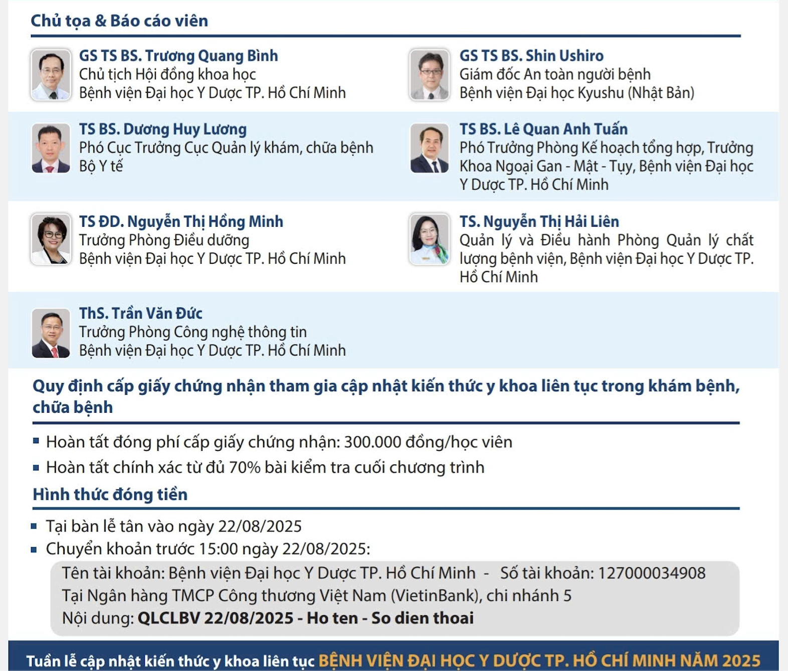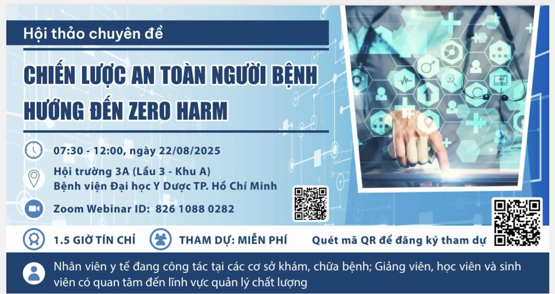 Sáng ngày 22/8/2025, tại Hội trường 3A – Bệnh viện Đại học Y Dược TP. Hồ Chí Minh, đã diễn ra hội thảo chuyên đề “Chiến lược an toàn người bệnh hướng đến Zero Harm”. Sự kiện thu hút đông đảo nhân viên y tế từ nhiều cơ sở khám, chữa bệnh, cùng các giảng viên, học viên và sinh viên quan tâm đến công tác quản lý chất lượng và an toàn người bệnh.