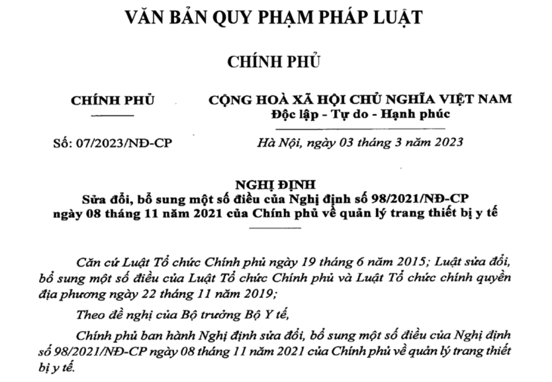 SỬA ĐỔI, BỔ SUNG MỘT SỐ ĐIỀU CỦA NGHỊ ĐỊNH SỐ 98/2021/NĐ-CP NGÀY 08 THÁNG 11 NĂM 2021 CỦA CHÍNH PHỦ VỀ QUẢN LÝTRANG THIẾT BỊ Y TẾ