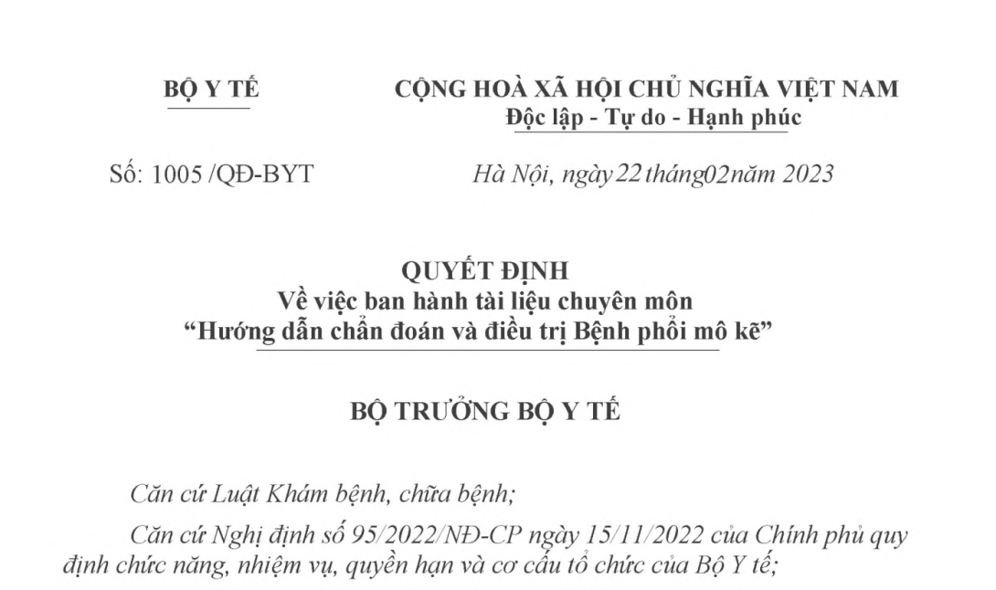 VỀ VIỆC BAN HÀNH TÀI LIỆU CHUYÊN MÔN “HƯỚNG DẪN CHẨN ĐOÁN VÀ ĐIỀU TRỊ BỆNH PHỔI MÔ KẼ”