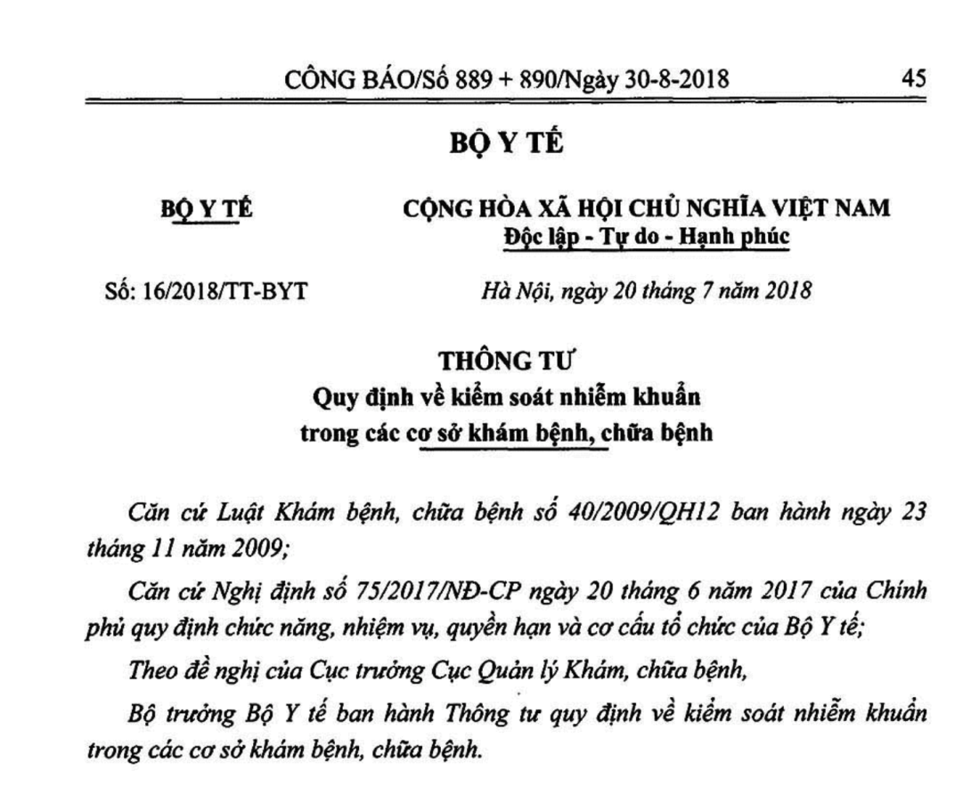 Bộ trưởng Bộ Y tế ban hành Thông tư quy định về kiểm soát nhiễm khuẩn trong các cơ sở khám bệnh, chữa bệnh.
