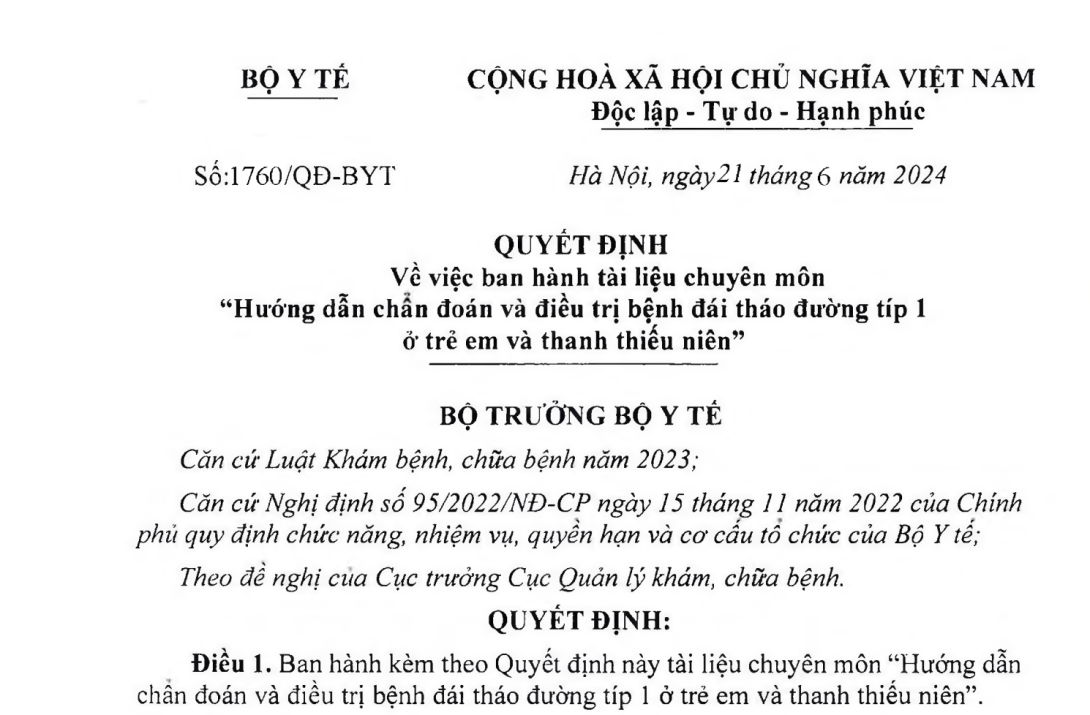 VỀ VIỆC BAN HÀNH TÀI LIỆU CHUYÊN MÔN “HƯỚNG DẪN CHẨN ĐOÁN VÀ ĐIỀU TRỊ BỆNH ĐÁI THÁO ĐƯỜNG TÍP 1 Ở TRẺ EM VÀ THANH THIẾU NIÊN”