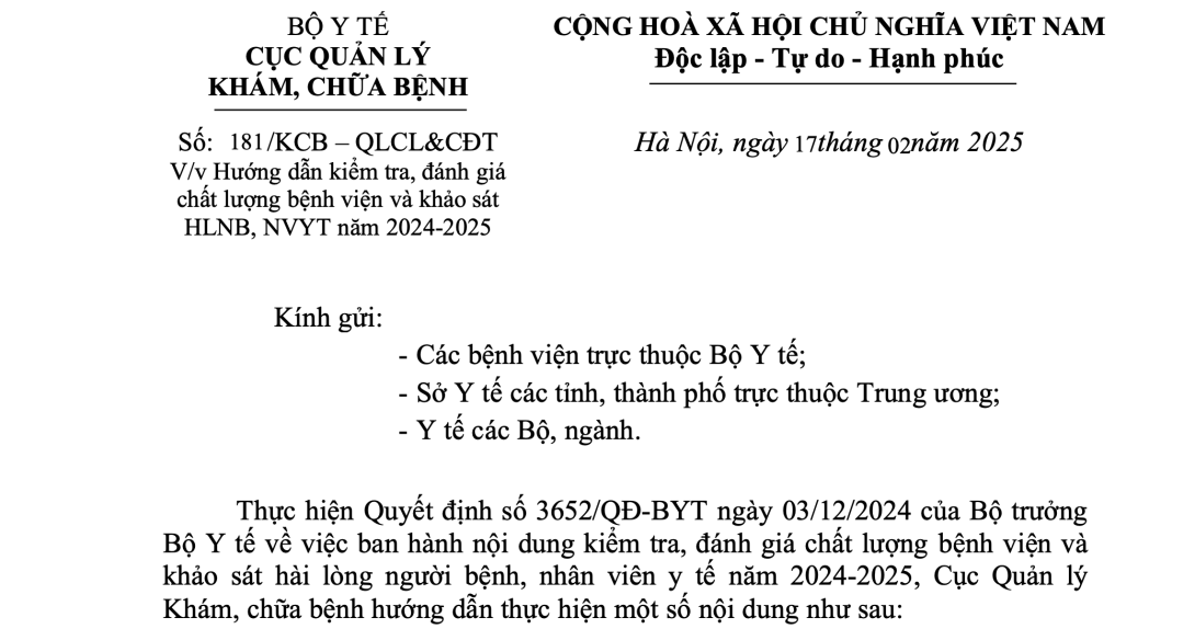 Thực hiện Quyết định số 3652/QĐ-BYT ngày 03/12/2024 của Bộ trưởng Bộ Y tế về việc ban hành nội dung kiểm tra, đánh giá chất lượng bệnh viện và khảo sát hài lòng người bệnh, nhân viên y tế năm 2024-2025, Cục Quản lý Khám, chữa bệnh hướng dẫn thực hiện một số nội dung như sau: