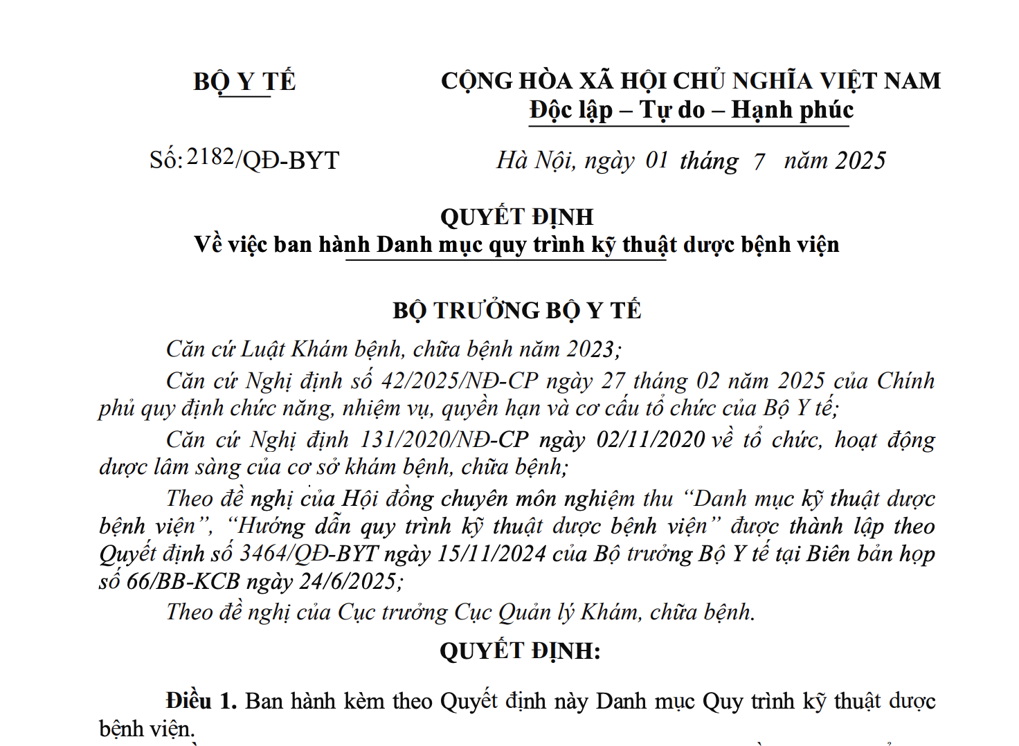 Theo đề nghị của Hội đồng chuyên môn nghiệm thu “Danh mục kỹ thuật dược bệnh viện”, “Hướng dẫn quy trình kỹ thuật dược bệnh viện” được thành lập theo Quyết định số 3464/QĐ-BYT ngày 15/11/2024 của Bộ trưởng Bộ Y tế tại Biên bản họp số 66/BB-KCB ngày 24/6/2025;