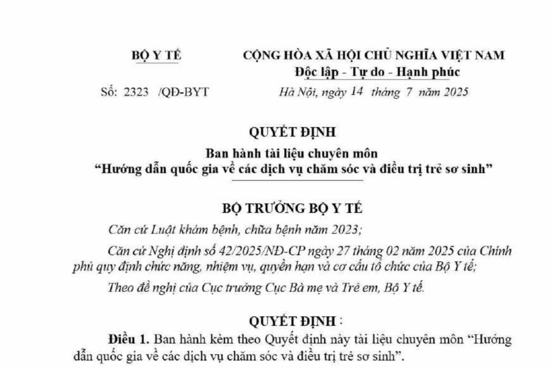 Điều 1. Ban hành kèm theo Quyết định này tài liệu chuyên môn “Hướng dẫn quốc gia về các dịch vụ chăm sóc và điều trị trẻ sơ sinh”.