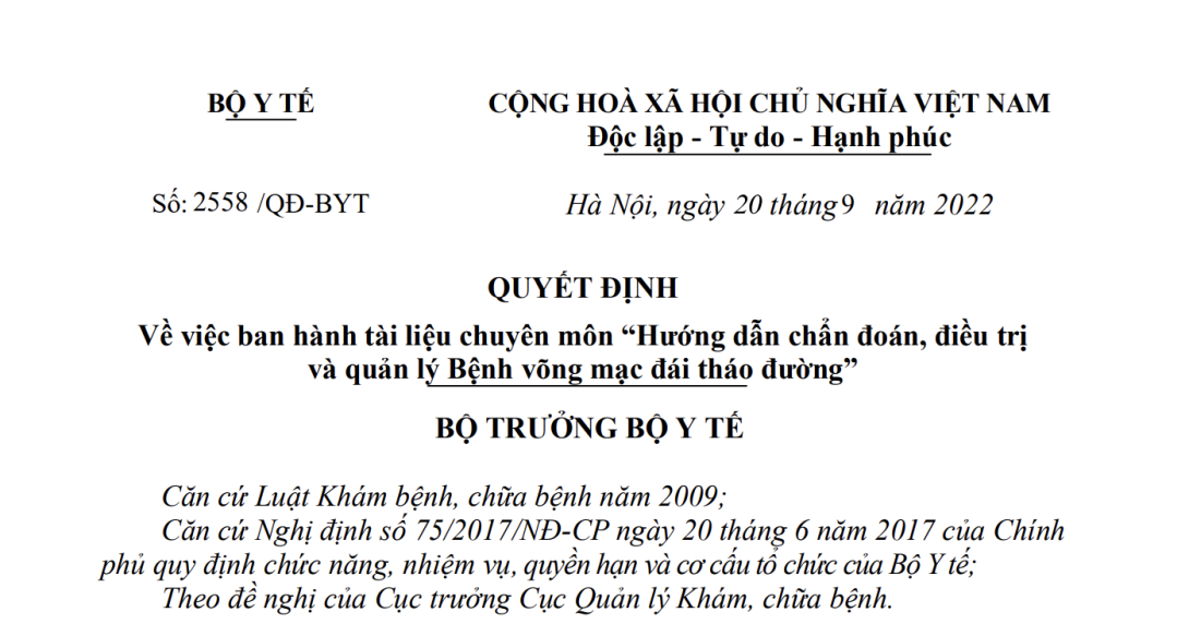 Quyết định 2558/QĐ-BYT ngày 20/09/2022 về tài liệu chuyên môn "Hướng dẫn chẩn đoán, điều trị và quản lý Bệnh võng mạc đái tháo đường" do Bộ trưởng Bộ Y tế ban hành